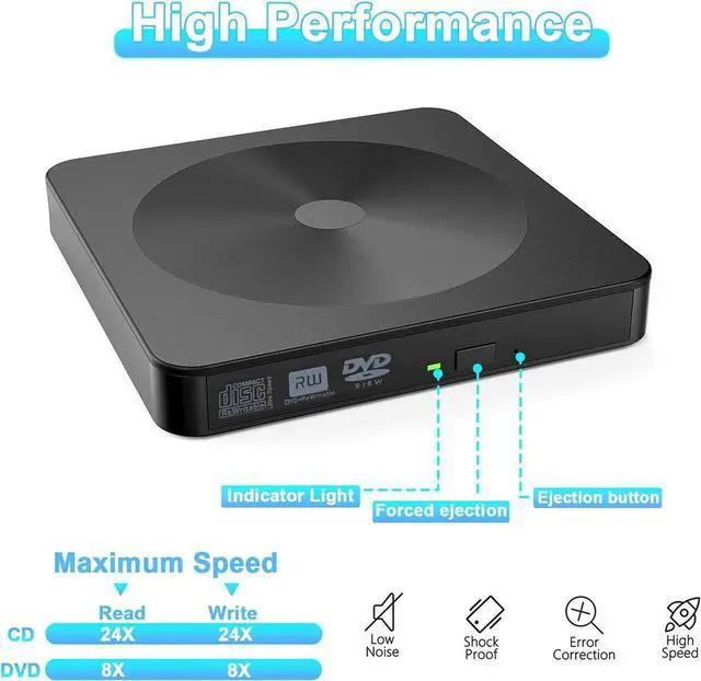 This disk drive is made of high-quality materials, shockproof, low noise and strong fault tolerance Intelligent. You can use this USB CD/DVD player to quietly read and write burned CD/DVD without stuttering and noise nor jammed discs.