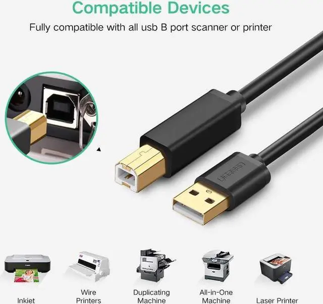 WIDE COMPATIBILITY: The Printer Cable is compatible with common devices with USB type B connector like Arduino, Blue, Brother, Canon, CyberPower, Dell, Epson, Fujitsu, HP, IOGEAR, Lexmark, M-Audio, Samsung.