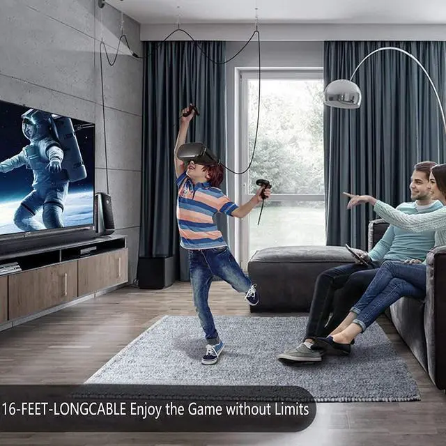 Features: Quest 2 and Quest Compatible It allows you to connect the Quest/Quest 2 to a PC and play VR games that require higher graphics power on your PC. It basically turns the Quest into an Oculus Rift. This way you can play both standalone and PC VR games. Plenty Space - 16ft This oculus quest link cable is made for Oculus Quest and Quest 2 VR headsets. It reaches 16 feet (5M), providing a best experience with flexible, lightweight durability. USB 3.2 Gen 1 - No Lag Oculus Link Virtual Reality Headset Cable for Quest and Gaming PC, USB C to USB 3.2. Transfer data to and from all your USB-C devices at speeds of up to 5 Gbps. It turns quest into Rift S with amazing zero lag graphics. Streaming & Charging The oculus link support usb c to usb a 3.0 and be able to stream the VR game and charge your headset at the same time.