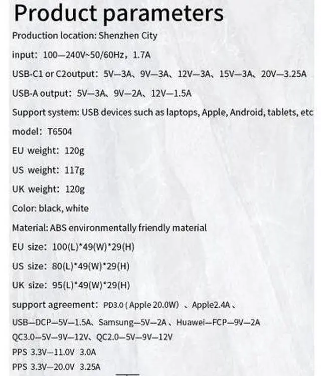 USB A: 5V3A, 9V2A, 12V 1.5A