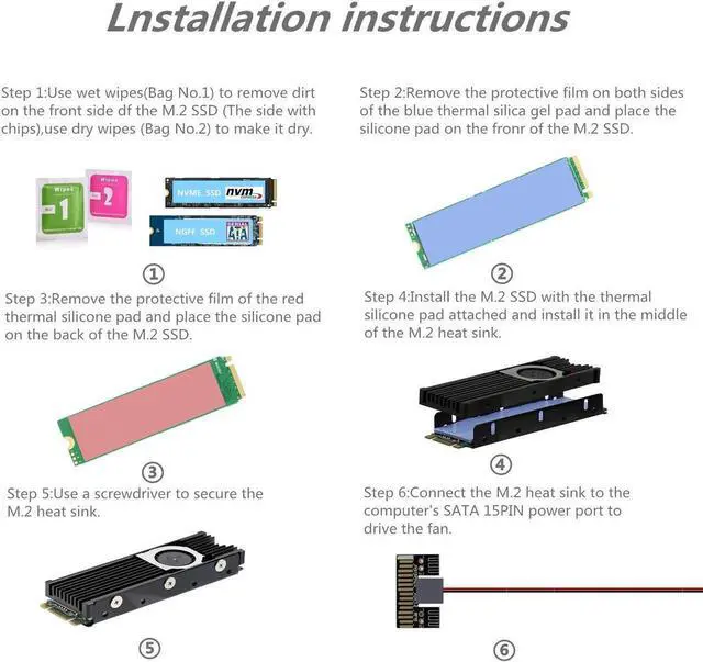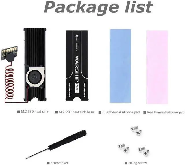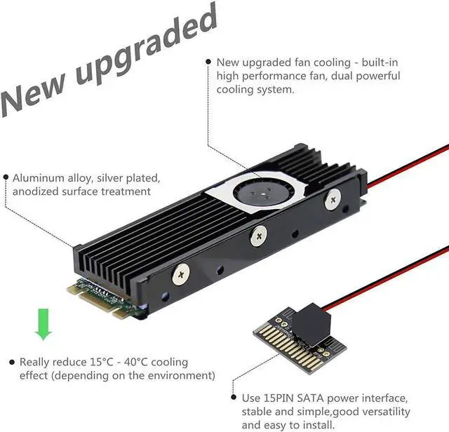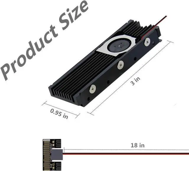 Highlights: Designed for Desktop PC - Specially designed for desktop computers, this M. 2 SSD heatsink compatible with M. 2 2280 SSD, perfectly fit for Samsung 850 EVO, 860 EVO, 960 EVO, 970 EVO, 950 PRO, 960 PRO, 970 PRO, etc. New upgrade fan cooling - Aluminum alloy - Groove design with high performance fan, dual powerful cooling system, with 15 ° C - 40 ° C cooling effect (depending on the environment), Improve your computer performance, perfect for gamers SATA power interface - Fan use 15PIN SATA power interface, stable and simple, 5V working voltage, good versatility and easy to install. Easy to Install and Operate - With double-sided clip design, 6 adjustable height screws, suitable for M. 2 SSD of various heights, stable installation, better protection of your M. 2 SSD. Fine Workmanship -