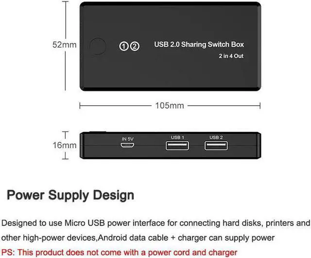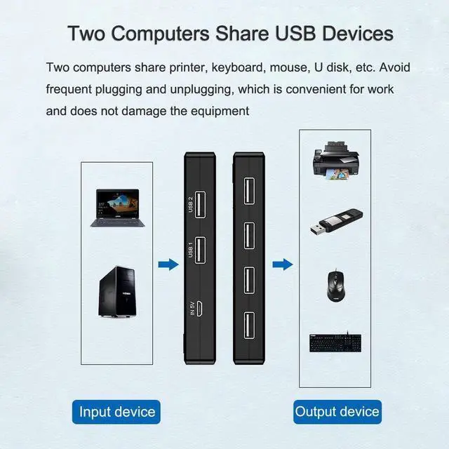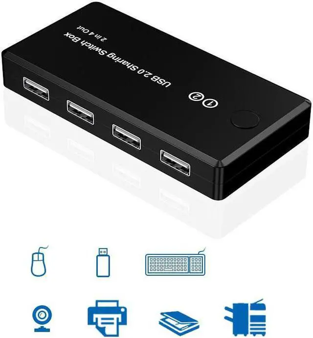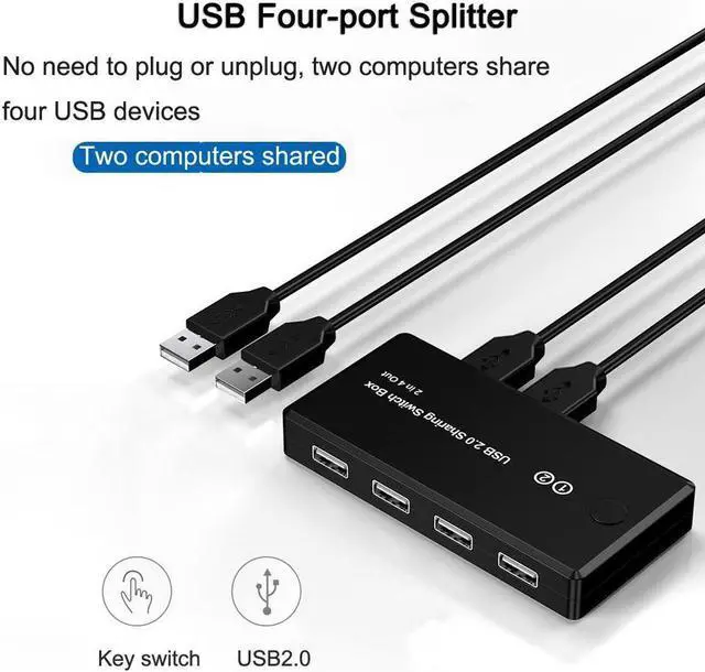 1. This 4-port USB shared switch allows a button to be exchanged between 2 computers, sharing 4 USB 2.0 peripherals without the need to constantly change cables or set up complex network sharing software.