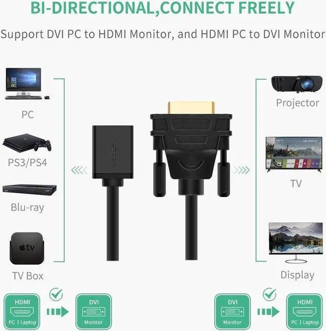 This cable not only converts signal from HDMI to DVI but also from DVI to HDMI; enables you to connect a HDMI equipped input device to DVI equipped output device, connecting a DVI equipped input device to HDMI equipped output device is also available. This convenient character makes the cable fit various using scenario.