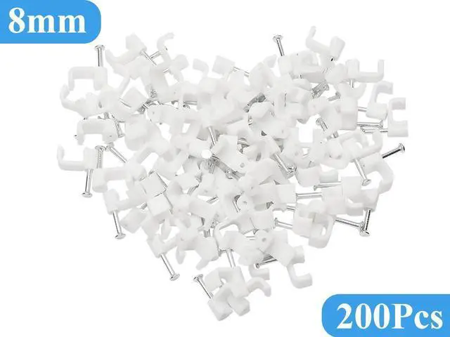 Ethernet Cable Clips White 8mm 200pcs, Single Coaxial Cable Clamps with Nail for CAT5, CAT6, CAT7 Flat Wire