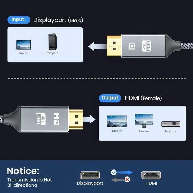 The DisplayPort to HDMI male to male cord/cable provides a cost-effective and easy solution for connecting a computer, desktop, laptop, or other devices with Display Port to HDMI Port display such as monitor, projector or TV, which is your preferred choice for seamless gaming, video streaming or extending a workstation.