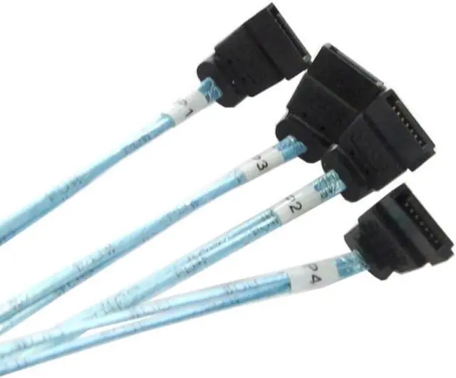 SFF-8087 to 4x right angle SATA mini SAS fanout cable eliminates accidental disconnections with sata connectors and offers 6Gb/s bandwidth.