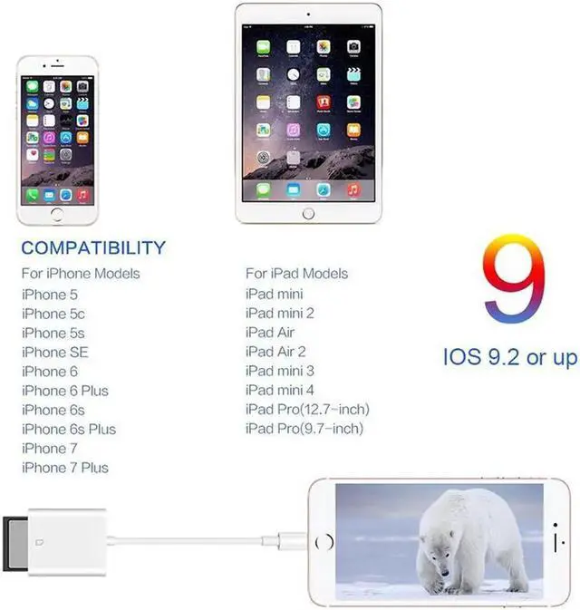 make sure your apple device is iOS 9.2 or up The image and video files must be at "DCIM" folder. Supporting SD card capacity 64GB max. Compatible for iPhone 6 / 6s / 7 / 7Plus / 8 / X and iPad Pro 12.9