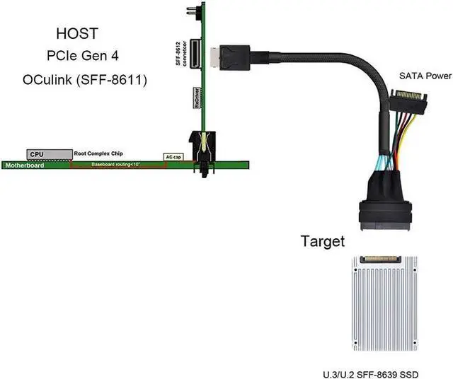 Oculink SFF-8611 to U. 2 U. 3 SFF-8639 NVME PCIe PCI-Express SSD Cable PCIe Gen 4 OCulink (SFF-8611) to U. 2 (SFF-8639) Cable Support PCIe 4.0 / 3.0 x4 Support data tansfer speed up to 12Gbps 1.64FT cable length