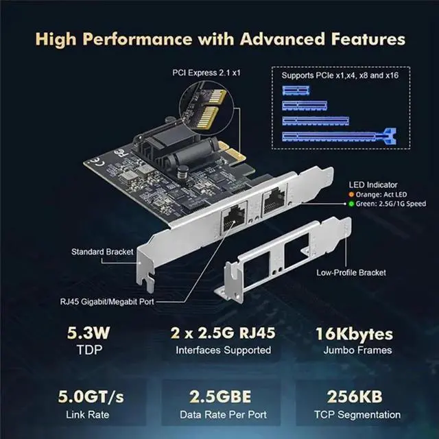 • 2.5GBase-T Gigabit Network Adapter with 2 Ports 2500Mbps PCIe 2.5gb Ethernet Card RJ45 LAN Controller Card