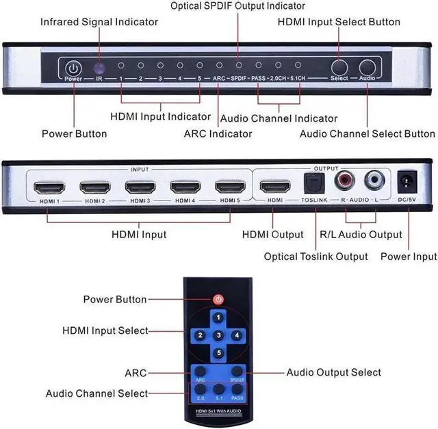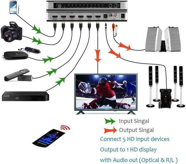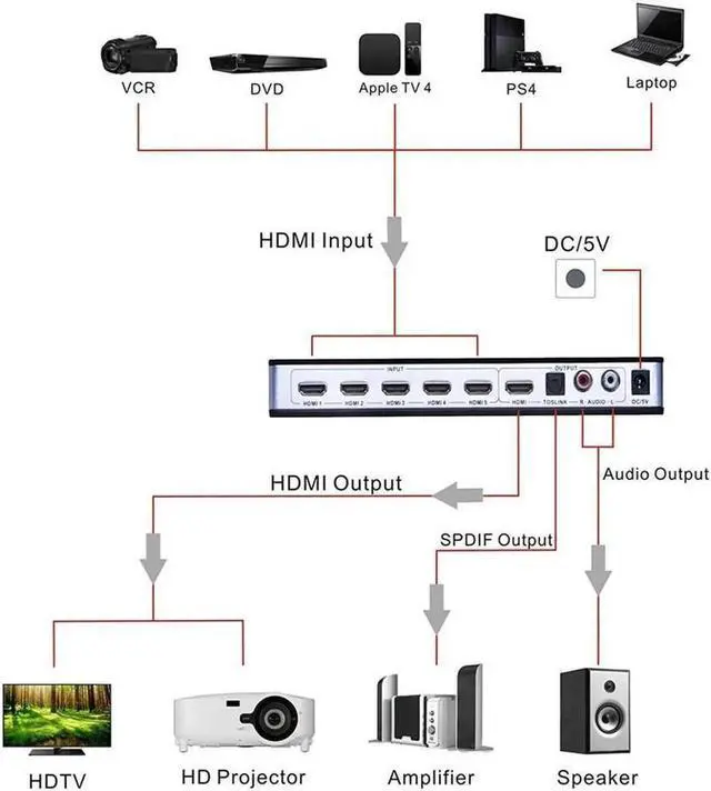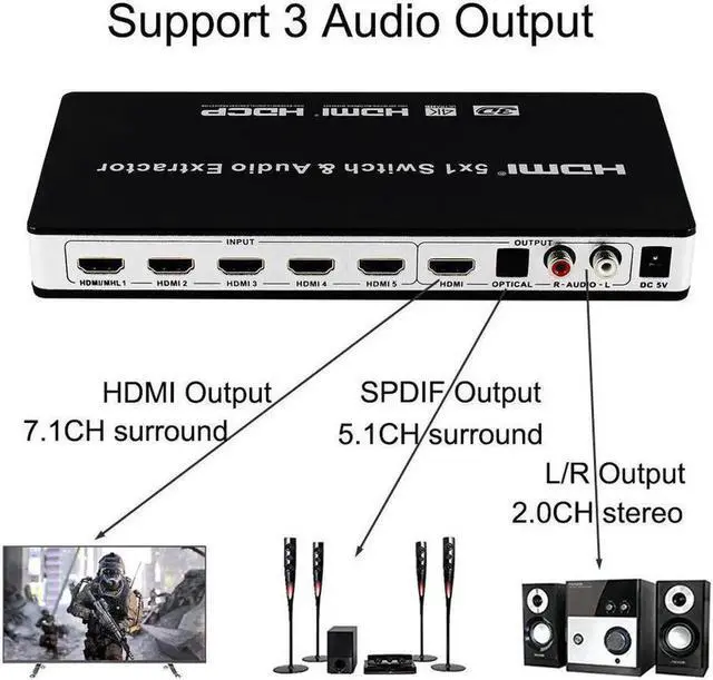 [Audio output] The HDMI Switcher allows you to extract and convert digital signal from HDMI input to 5.1 channel digital surround on Toslink S/PDIF optical output or 2.0 channel analog stereo on L/R 2RCA output.