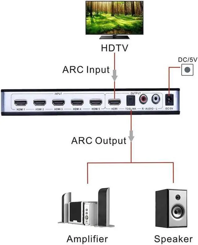[5 port HDMI switch] hdmi switch 5 in 1 out & Audio Extractor SPDIF/RCA stereo outputs with Ultra HD 4K ARC EDID setting allows you to connect five HDMI inputs to one HDMI output