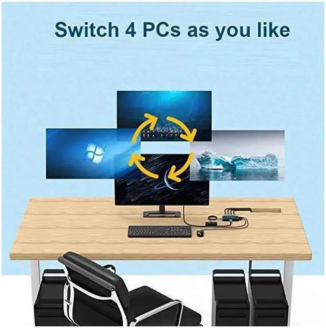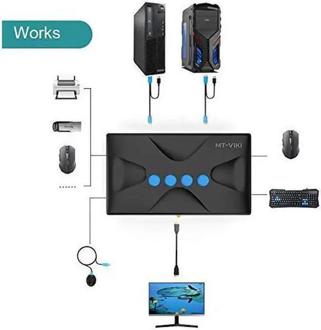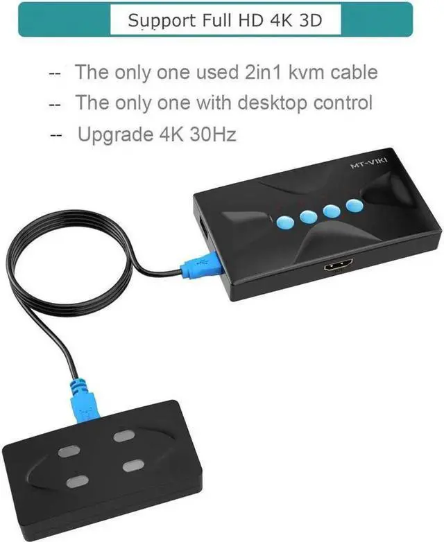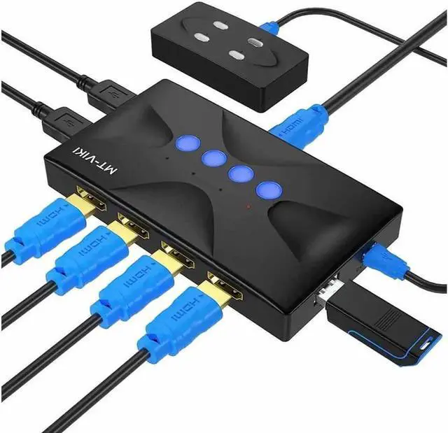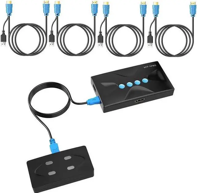 - MT-VIKI HK04, 4K HDMI KVM switch 4 ports, allows to manage 4 computers by only 1 set of monitor, usb/wireless keyboard & mouse, and share 1 printer/U disk for 4 computers