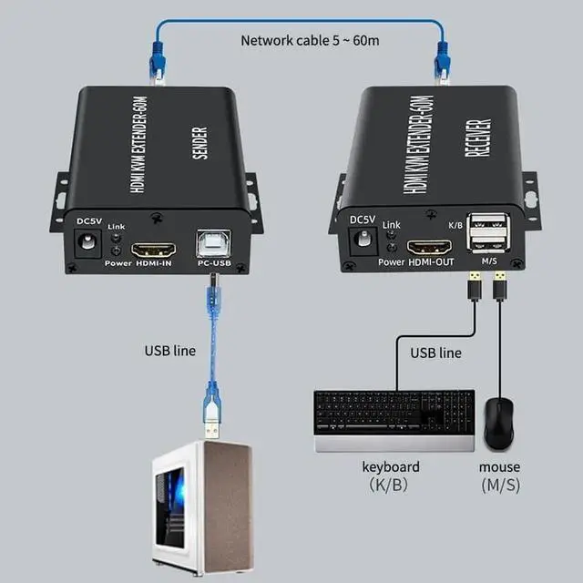 • HDMI-Compatible KVM Extender 60M Over Cat5/6 Ethernet Cable 1080P USB Audio Video Converter For PC TV Monitor