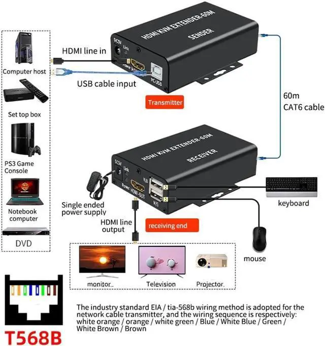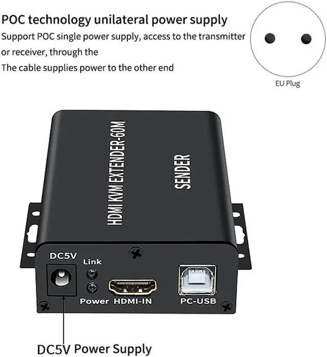 • HDMI-Compatible KVM Extender 60M over Cat5/6 Ethernet Cable 1080P USB Audio Video Converter for PC TV Monitor-EU Plug