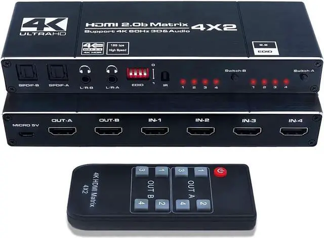 HDMI Matrix Switch 4x2, 4K HDMI Matrix Switcher Splitter 4 in 2 Out Box with EDID Extractor and IR Remote Control Support 4K HDR, HDMI 2.0b, HDCP 2.2, 4K @60Hz, 3D, 1080P
