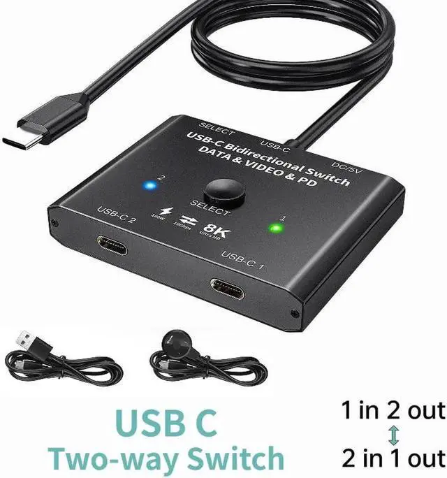 • 100W USB Type-C Two-way Switcher Splitter 2x1 1x2 Bi-Direction KVM Data Video For Computer Monitor Mobile Phone Multiple Source