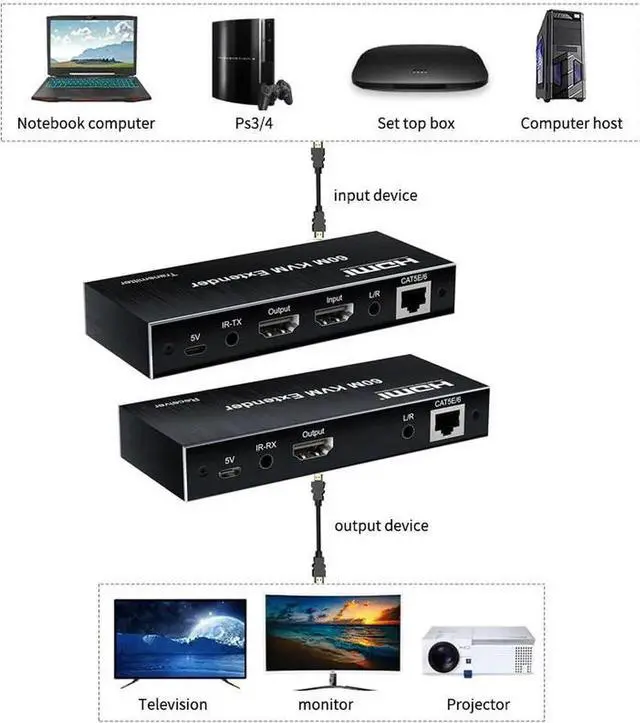 • USB KVM Extender RJ45 HDMI Extender 60M Via Ethernet Cat5e Cat6 Cable for PS4 PS5 Xbox DVD Switch Player PC Laptop To TV Monitor