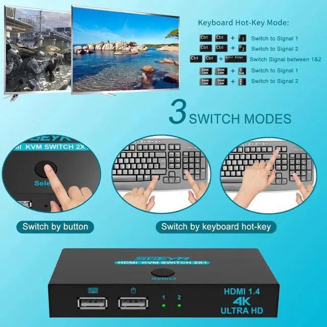 • SGEYR 2x1 HDMI KVM Switch 4K 2 Port USB KVM Switch 2 PC 1 Monitor KVM Switch Keyboard Mouse Share Support 4Kx2K@30Hz 3D 1080P