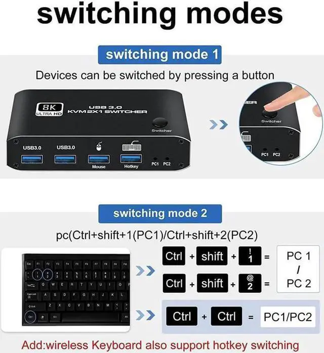 There are two switching modes: button switching and hotkey switching, which eliminates the need for unplugging and plugging, which is convenient and fast.