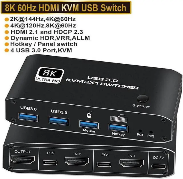 [8K HDMI KVM Switch 2 in 1 out] KVM Switch Box allows you to control 2 computers with one set of controls and display (mouse and keyboard).
