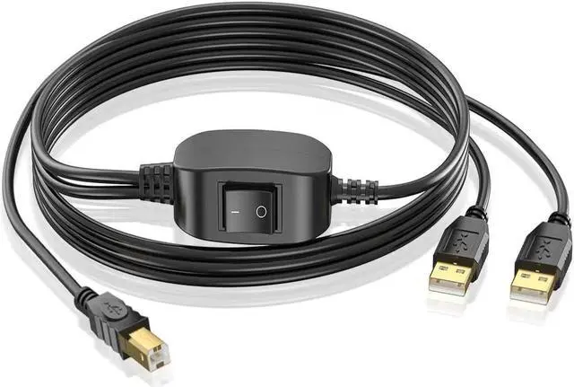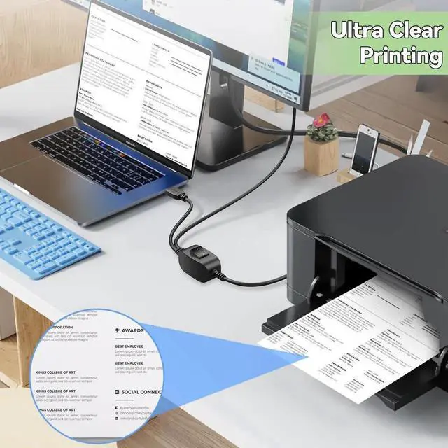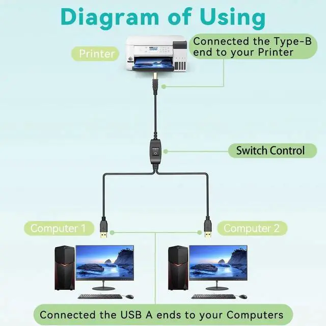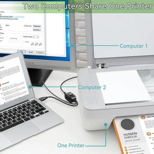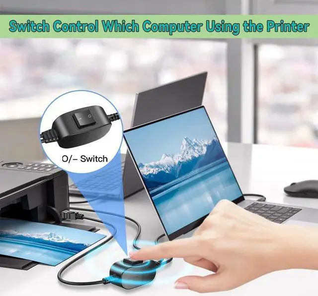 5FT Printer Cable Splitter: This usb splitter 1 in 2 out allows you to transfer data to print at the speed of USB 2.0, but ONLY ONE computer/laptop can use the printer at a time, you can control the Switch to select which computer you need it to work, save the troubles of unplug and resetting the cable frequently!