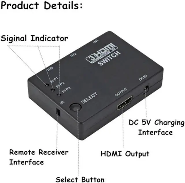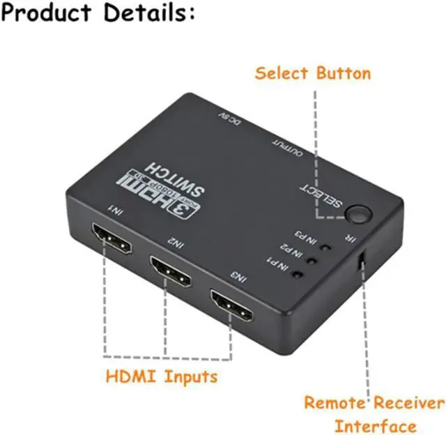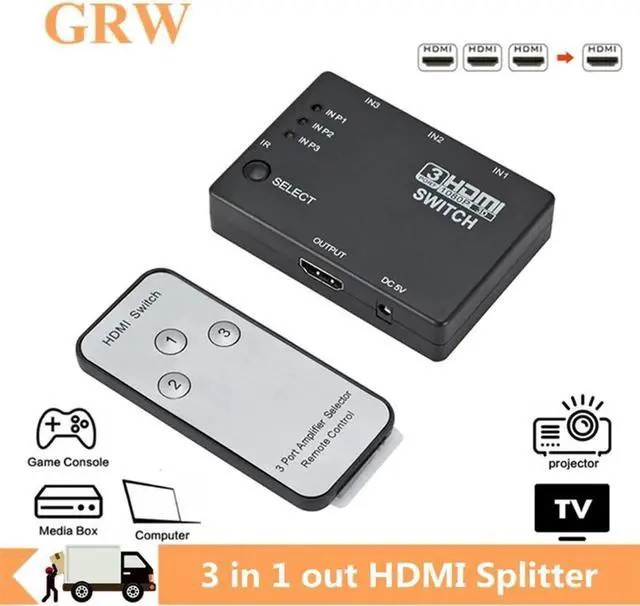 • GRWIBEOU HDMI Switcher 3 In 1 Out 3 Ports Hub Box Auto Switch 1080p HD 1.4 With Remote for HDTV XBOX360 DVD Projector