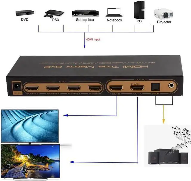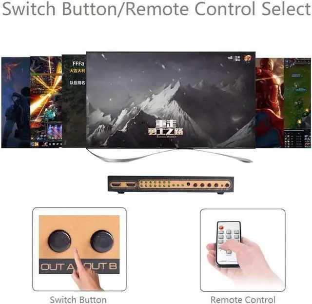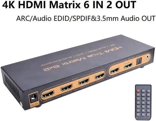 HDMI Switch 6 in 2 out: This HDMI switcher designs with six inputs and two outputs, which allows splitting the videos to two HDMI displays simultaneously.