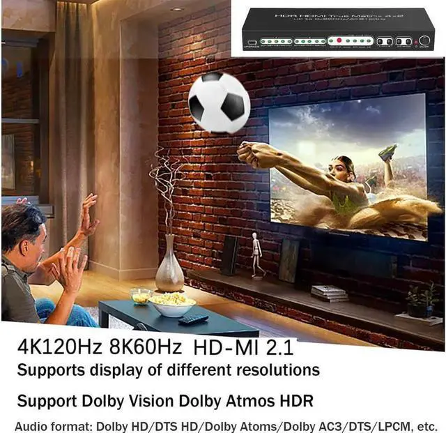 [Supports audio independent EDID] HDMI Matrix 4x2 can extract audio signal from HDMI input source and output via optical SPDIF (supports 5.1CH Dolby HD, DTS HD, Dolby Atoms, Dolby AC3, DTS or 2CH LPCM) and analog RCA (supports 2CH LPCM only).