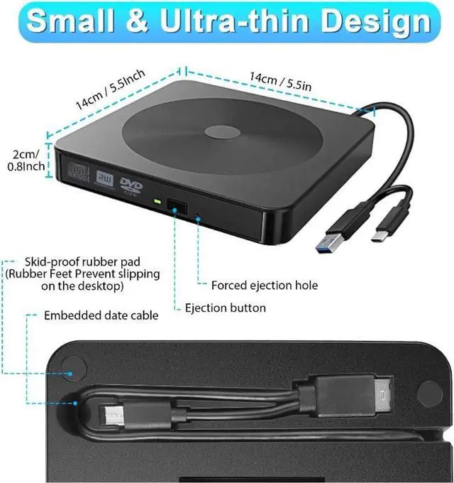 The USB 3.0 & Type-C external optical cd/dvd drive burner is perfect companion for laptop or desktop without internal DVD drive.