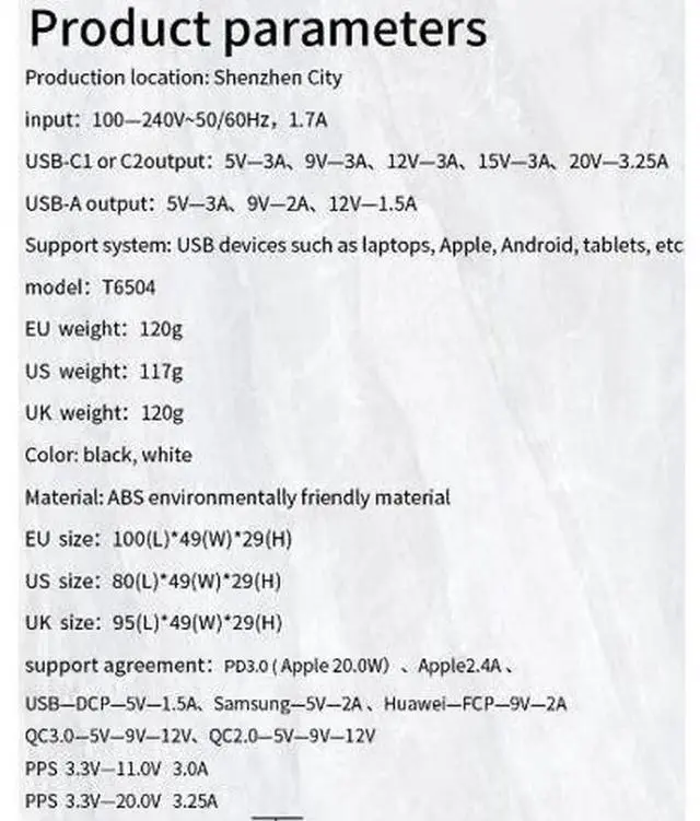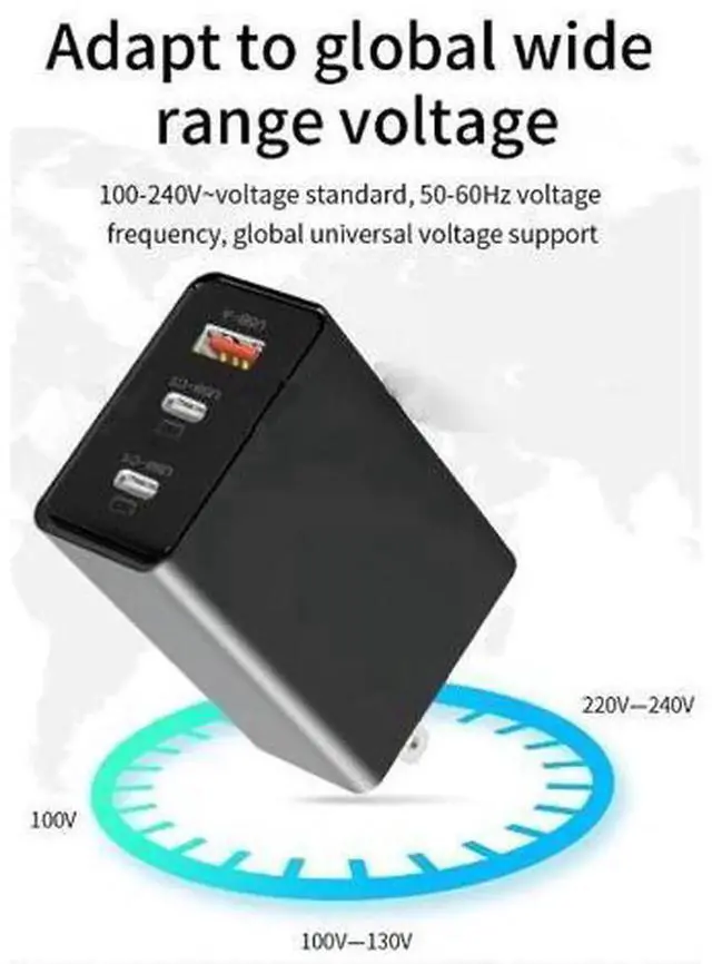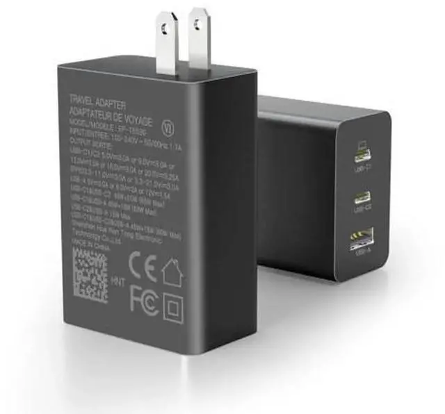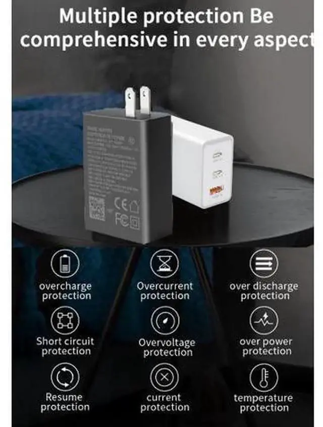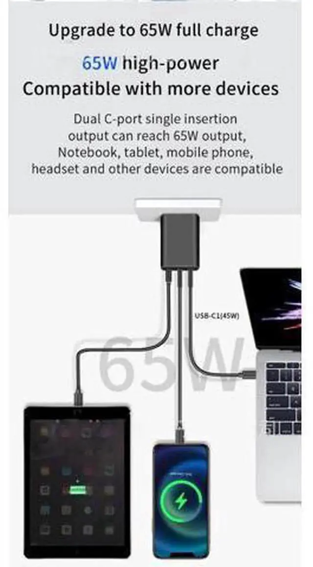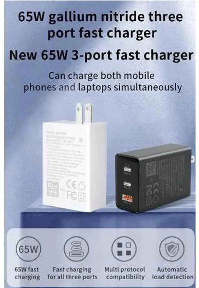 The 65W USB wall charger has 2 USB-C charging ports and a USB-A charging port, which can fast charge your phone, laptop, or other devices at the same time.