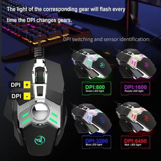 Features: - Two Modes The default mode of this mouse is office mode, you can long press the DPI button for 3 seconds to switch to the game mode. - 7 Keys Programmable Easy to operate, convenient to use. - 4 Adjustable DPI Support multiple DPI free adjustments such as 800/1600/3200/6400. Meet a variety of needs, regardless of home/office/game battle can be handy. High precision 6400DPI provides stable transmission and accurate analysis. - Professional Game Chip Adopt professional IC 198 esport game engine, stable transmission. Analytical accuracy DPI up to 6400, compatible with all kinds of large online games. - Cool RGB Light Effect 1680 million color backlight modes, provide different color effect when used. The light of the corresponding gear will flash every time the DPI changes, adds fun to your work and life. - Removable Weight Design With two 5g removable weights, no need to remove the mouse, you can add or subtract your own mouse weights according to your need. - Wide Application The mouse can be applied to different occassions, such as E-sport game, daily office work, home use.