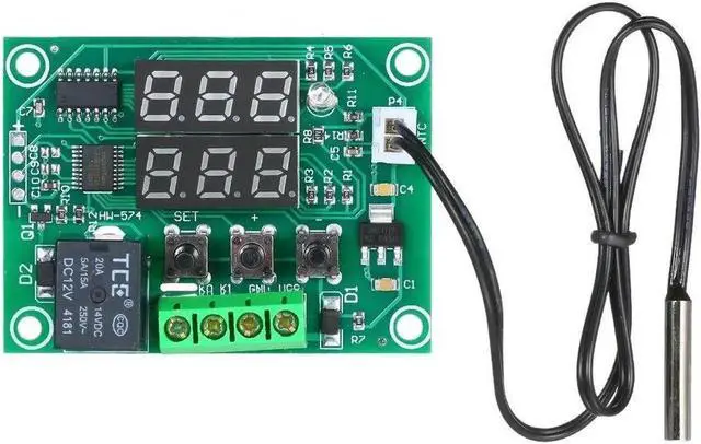 XH-W1219 Digital Temperature Controller Dual Digital Thermostat Thermometer Heating & Cooling Control Module Dual Digital Temperature Control Module PCB Board Features:The temperature controller features of two-color digital tube, convenient and practical. User-friendly indicator light, three-button compact design, relays are safe and reliable. and the European terminal is made of durable environmental protection material.Dual LED display for measuring temperature and setting temperature. The temperature measuring range is -50~110.ST core chip is safe, reliable and had stable performance. Double-layer circuit board has military quality to ensure its long time using.Standard equipped with a 0.3m waterproof probe, it has high sensitivity, strong sealing and water resistance, even leakage is also weak, very safe to use. Silicone sealing treatment, more suitable for liquid inspection.Wide applications in control temperature of equipment cabinet, industrial equipment control boiler, scientific planting control temperature, etc.Specifications:Material: PCBControl Range: -50~110Control Accuracy: 0.1Measurement Input: NTC10K, waterproof sensor L=0.5MHigh Temperature Alarm: -49~110Input Voltage: DC12VOutput: Relay output, max. 10AReturn Difference Setting: 0.1~30Delay Start: 0~10 minutesTemperature Calibration: -10~10Cable Length: 30cm / 11.81inItem Size: 60 * 45 * 17mm / 2.36 * 1.77 * 0.67inItem Weight: 23g / 0.81ozPackage Weight: 25g / 0.88ozPackage Size: 12 * 8 * 2cm / 4.72 * 3.15 * 0.79in