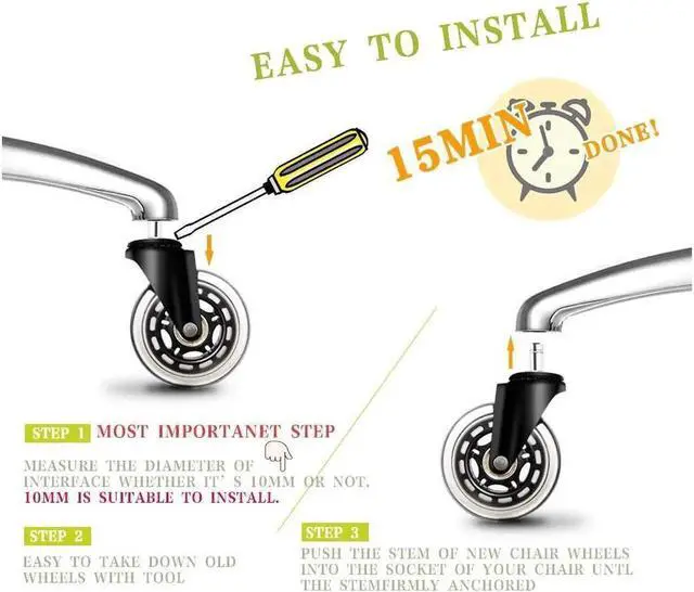 EASY ASSEMBLY IN 2-5 MINUTES. Simply pull out the old office chair caster for desk chair mat to replace these into place without tools. The desk chair wheels have passed through the testing of BIFMA and ROHS.