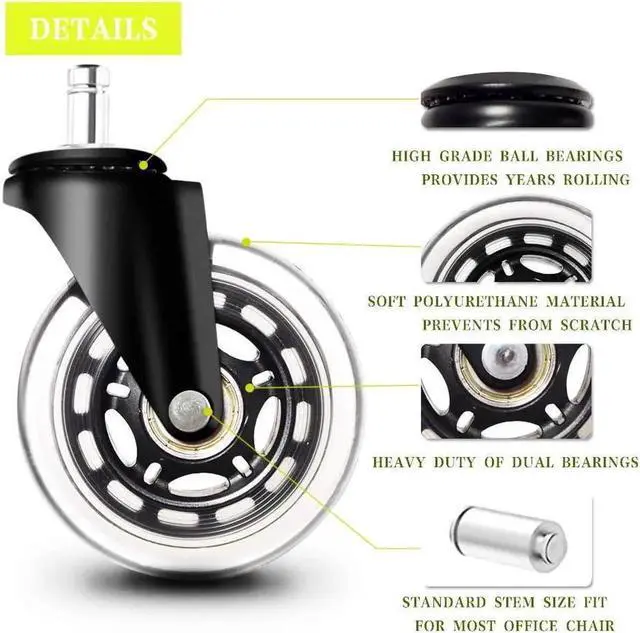 LONG LIFETIME USAGE. The big chair wheels replacement, its sturdy steel structure with premium dual bearings could up to 650LBS (about 295KG) as a set of 5 office wheels for hardwood floors.Heavy duty, safety, rolling smoothly and no more squeaky sound from your office chairs.