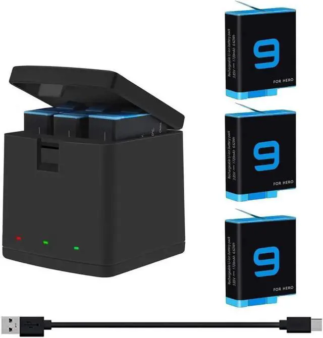 Storage design charger: 3-channel unique and compact Charger designed with a closed lid for Gopro battery, can storage and charge 3-Pack Hero 9 / Hero 10 / Hero 11 batteries (also compatible with Go Pro battery) simultaneously and independently from any 5V 2.1A max USB power source, reduce the need for multiple charges. Red for charging, Green for charging completed.