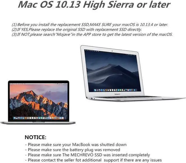 Requires macOS 10.13 High Sierra or Later; DO NOT compatible with earlier than macOS 10.13 versions. Please use your original SSD to upgrades your macOS before installation.