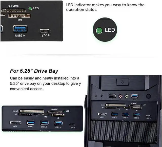 Can be easily and neatly installed into a 5.25" drive bay on your desktop to give you convenient access.