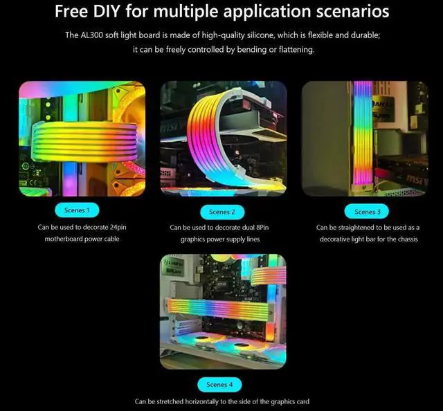 (1): Tie fixing:The AL200 flexible light board can be installed on the graphics card and the power supply line of the motherboard by fixing it with a tie.