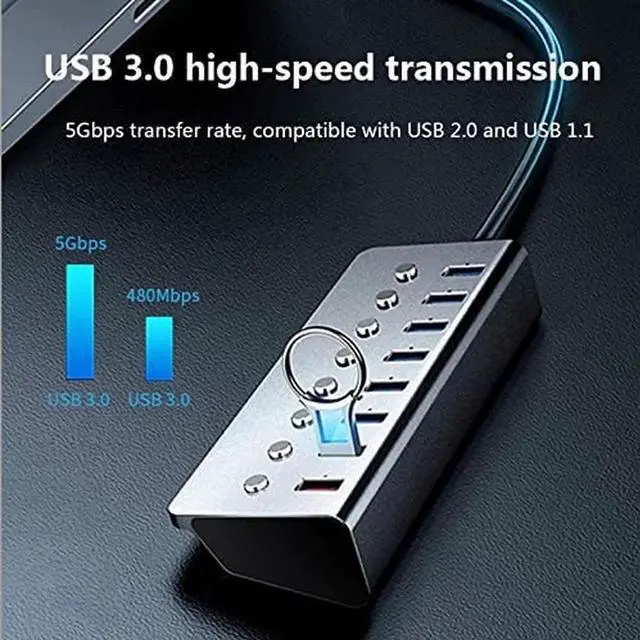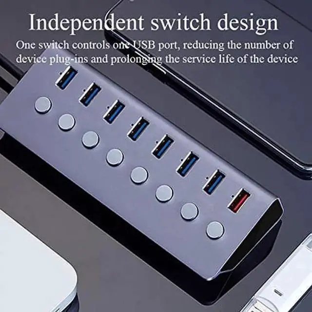 Each port on the USB 3.0 hub has its own power switch so you can turn off devices when they're not in use and each individual USB port is independently controlled and not affect each other. the blue LED indicator flashes when in use make it easier for you to recognize on/off of the USB ports.