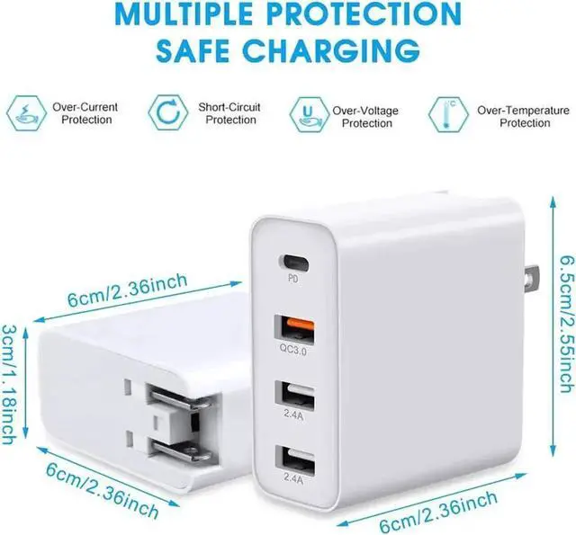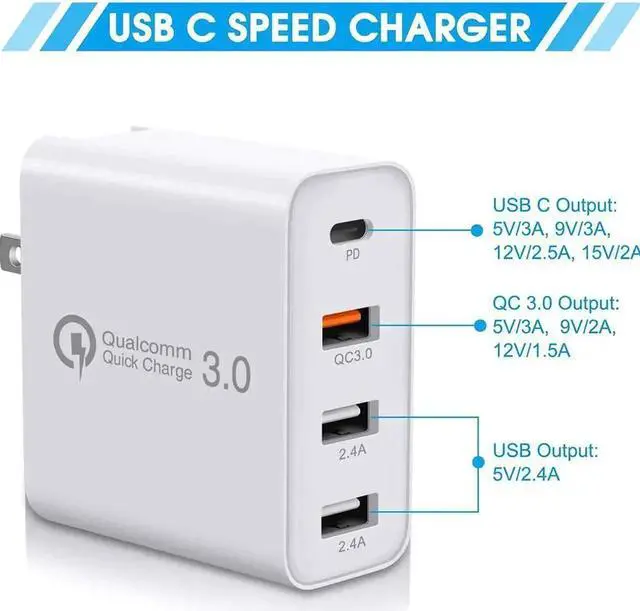 2. 1 Type c port and 3 USB ports ( quick charge 3.0 and 2 usb port 5V/2.4 A Max ), charging 4 devices at the same time.