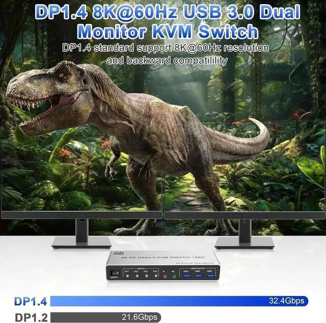 8K@60Hz DP KVM Switch 4 Computers share 2 Mnitors (DP + DP) and 3 USB 3.0 Ports