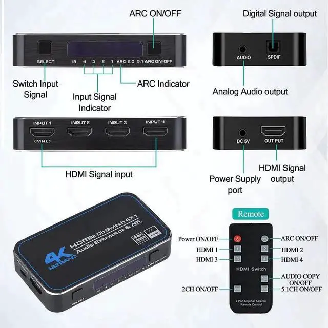 2.0 (YUV 4:2: 0), can easily select 4 HDMI sources that scale up to 4K@60Hz to a single HDMI output which your want to output. The HDMI Switcher support 12bit per channel (48bit all channels) Deep Color, Support ARC function. The HDMI Output can be selected by a local button or an IR wireless remote control.