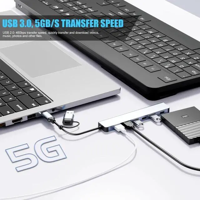 7-in-1 Versatility: Unleash the full potential of your devices with Luventgs multifunctional USB C Hub. Featuring 1 x USB 3.0 (5Gb/s transfer speed) for rapid file transfers 4 x USB 2.0 (480bsp transfer speed) for multitasking and 2 x USB C 2.0 ports this hub transforms your work and entertainment space into a high-speed multifaceted hub.