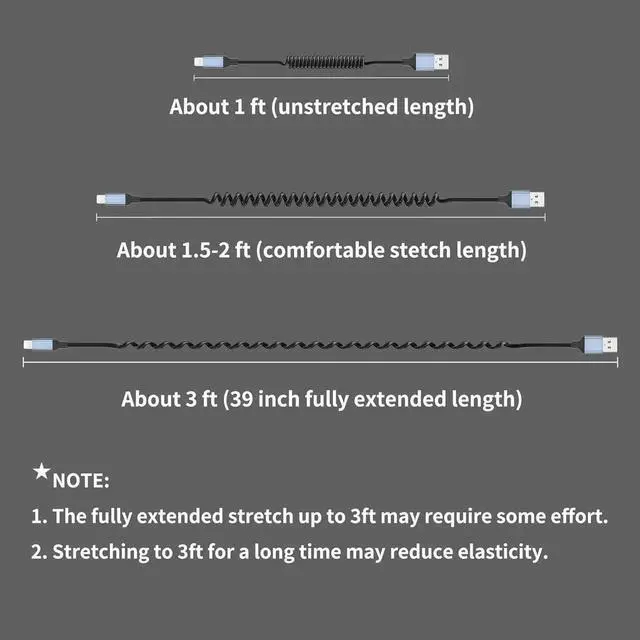 Easy to use for different occasions perfect for your needs. NOTEDue to the coiled design the stretch is a little tight. The unstretched length is about 1ft. The comfortable stetch length is about 1.5 -2 ft. The fully extended stretch up to 3ft (39 inch fully extended length) may require some effort. Keep stretching to 3ft for a long-term use may reduce elasticity. What You GetCoiled Lightning Cable 2 Pack our worry-free 24-Month warranty and lifetime customer service if you have any problem about our product please feel free to contact us we will solve it within 24 hours.