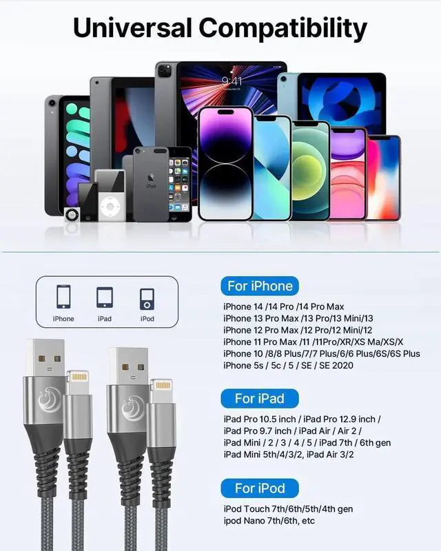 ![Main image of iPhone Charger [ MFi Certified] 2Pack 10FT Long Lightning Cable Fast Charging Nylon Braided iPhone Charger Cord USB Cable Compatible with iPhone 14 13 12 11 Pro Max XR XS X 8 7 6 Plus SE iPad](https://c1.neweggimages.com/productimage/nb640/C1M4S25091607BUZD55.jpg)
