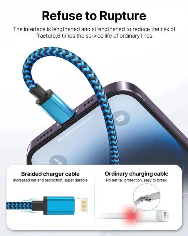 Charger Cord: 3 colorful iPhone charging cable. Aioneus iPhone charger cable is covered with a braided nylon sheath. The braided nylon insulation and precision layered welded connectors make this cable more durable and stronger than regular iPhone charger cables while being flexible and tangle-free. The iPhone charging cable is designed with a reinforced connector that has been tested to over 30 000 bends for extra protection and durabilityHigh