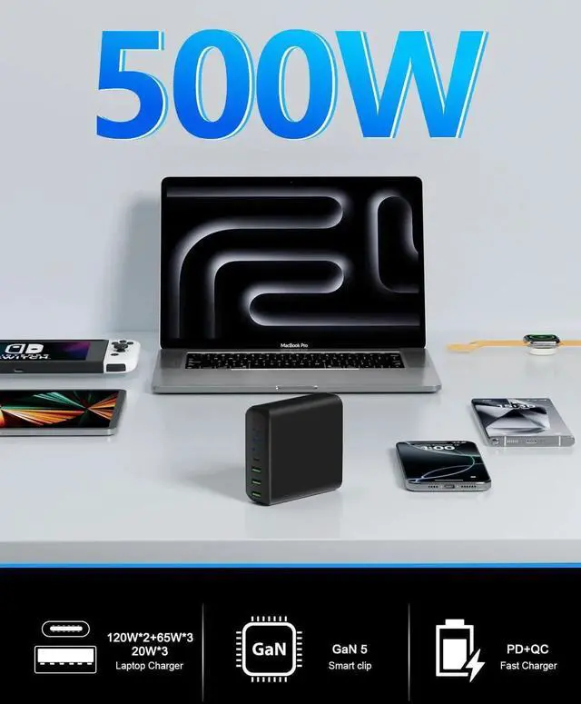 USB C Charger: Experience the convenience of super fast and ultra-high output charging with this 500W desktop charger featuring 5 USB-C and 3 USB-A ports to power up your essentials simultaneously. No need for more adapters you can use just one outlet to plug in laptops tablets smartphones Bluetooth speakers and other small gadgets like earbuds smartwatches game consoles etc. 8 in 1 USB C Charging Station 120W x 2 USB C and 65W x 3 USB C+ 20W x 3 USB A (500W Total) Our USB C charging stations feature 8 independent output ports. power delivery Compatible with laptops phones tablets headphones smartwatches and more. The fast charger type c charger power supply has an input voltage of 100-240 volts when you connect 8 devices the power will be distributed the ports to ensure you get the best charge. Universal Charging Station Compatibility This charger block with USB-C and USB-A ports supports a wide range of devices 2 x 120W USB-C Power Delivery Compatible with Smartphone Tablet and Laptop Work For MacBook Pro 13''/ MacBook Pro MacBook Air MacBook iPhone 16/15/14/13/12/X/Pro Max/Mini Plus/XS Max/XS/X/XR/8 Plus/8 iPad Pro/Air/Mini Galaxy S23/S23+/S23 Ultra/S22/S22+/S22 Ultra/S21/S21+/S21 Ultra/S21+ 5G S20/S20 Ultra/S20+/S20 FE Note 10/Note 10 5G Note 20/20 Ultra 5G/S10 5G Galaxy Z Fold 3 5G A90 5G A80 A70 Book S Tab S7/S7+/S8/S8+/S8 Ultra as well as Switch speakers iwatch and more.
