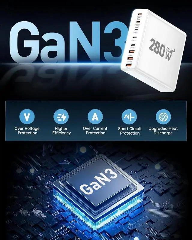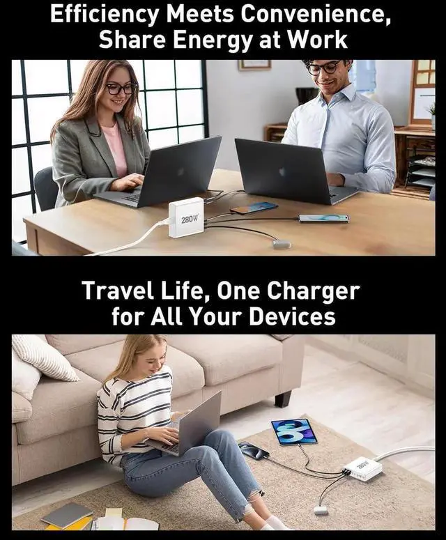 8 in 1 USB C Charging Station 65W x 2 USB C and 30Wx3 USB C+20Wx3 USB A (280W Total) We USB C charging stations feature 8 independent output ports. power delivery Compatible with laptops phones tablets headphones smartwatches and more. The fast charger type c charger power supply has an input voltage of 100-240 volts when you connect 8 devices the power will be distributed the ports to ensure you get the best charge. Fast Charging GaN ChargerEdiliow USB C Charger adapted GaN III generation chip technology. Built-in multi-protection system and premium microchips reduces the size and weight of the usb c charger block and With higher energy efficiency upgraded heat dissipation Gallium Nitride (GaN) makes our chargers smaller and safer greatly increase the charging efficiency.