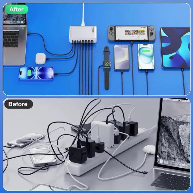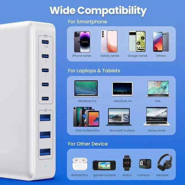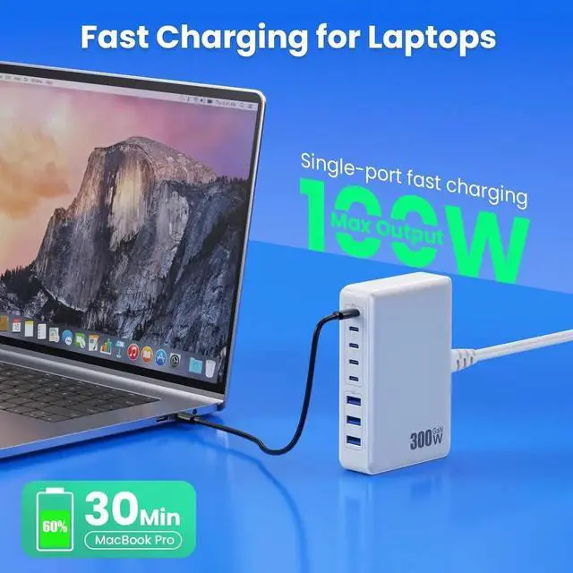 300W Super Fast 8-in-1 Usb C Charger BlockOur USB charger provides multi charging options to meet your different needs. With 5*USB C ports and 3*USB A ports no need for more adapters you can use just one outlet to plug in laptops tablets smartphones Bluetooth speakers and other small gadgets like earbuds smartwatches game consoles etc. Our USB C charging stations feature 8 independent output ports ensuring all devices can charge simultaneously at full speed without power sharing and disconnection this 8-in-1 charging station will reduce your accessories burden and help you create an organized and clean desktop.
