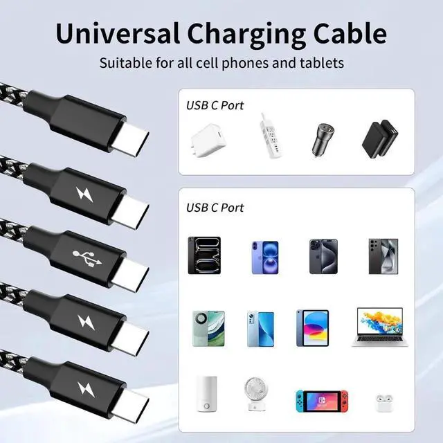 USB C CABLE: Our latest USB C to USB C cable features four identical flat C ports. Each port functions independently allowing you to charge four devices simultaneously without any interference. Devices are charged at their optimal speeds. Unlike traditional single USB C cords this C to C cable quadruples charging efficiency saving you precious time and making your travel and office life much more convenient.